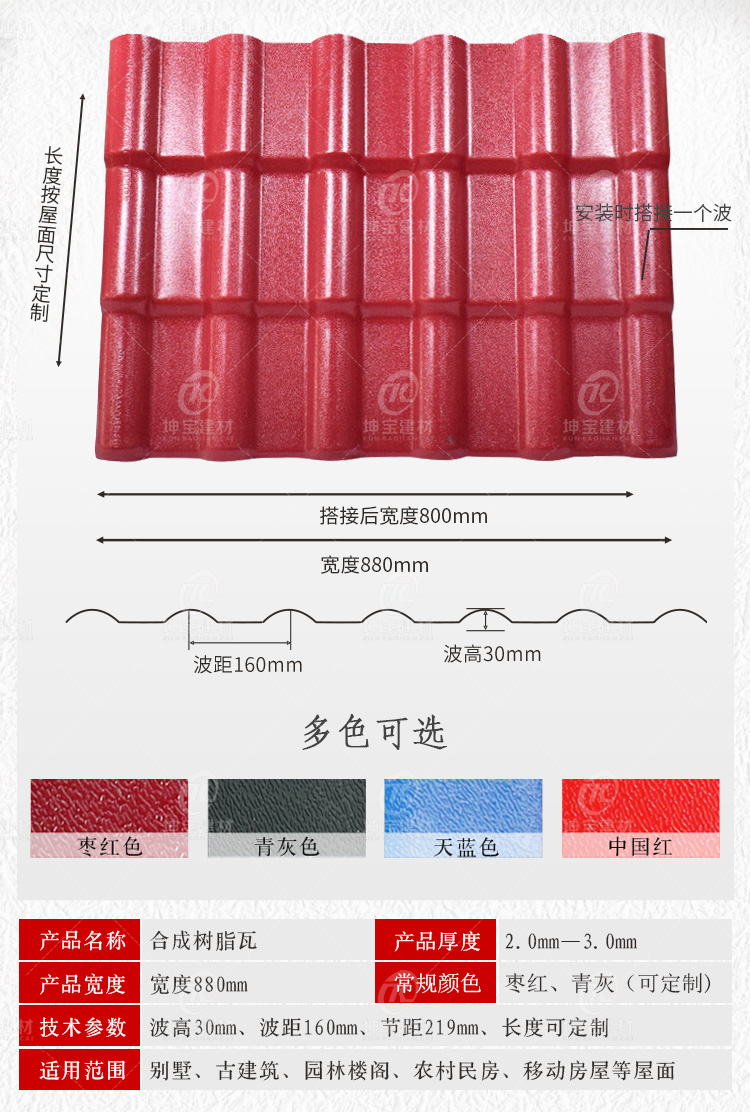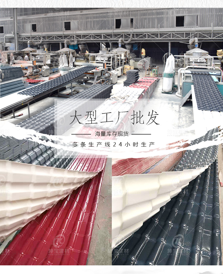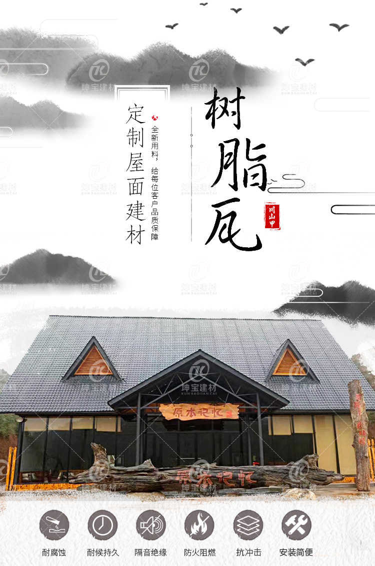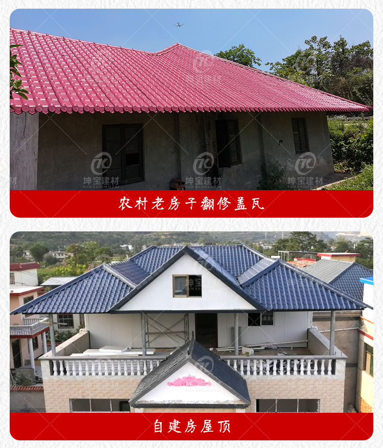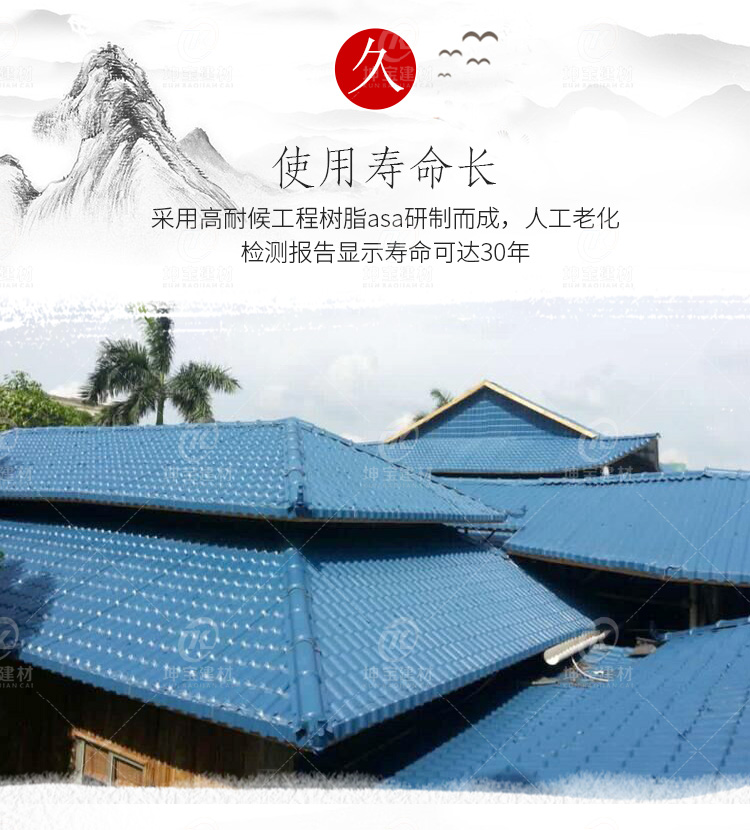 坤寶合成樹(shù)脂瓦采用高耐候ASA樹(shù)脂、韌性骨架層和高強(qiáng)度PVC耐磨層三層共技?jí)褐贫桑攸c(diǎn)是色彩豐富并經(jīng)久不褪,造型美觀立體感強(qiáng)且符合中國(guó)建筑文化特色。同時(shí)它還具有質(zhì)輕、防水、堅(jiān)韌、保溫、隔音、防腐蝕、抗風(fēng)防震、抗冰雹、抗污染、防火、絕緣、安裝簡(jiǎn)便等優(yōu)點(diǎn),是各類(lèi)建筑表面裝飾和防水的理想材料,尤其適用于我國(guó)目前大力推廣的平改坡、新農(nóng)村建設(shè)、新城鎮(zhèn)化、別墅屋面、民用建筑等屋面。