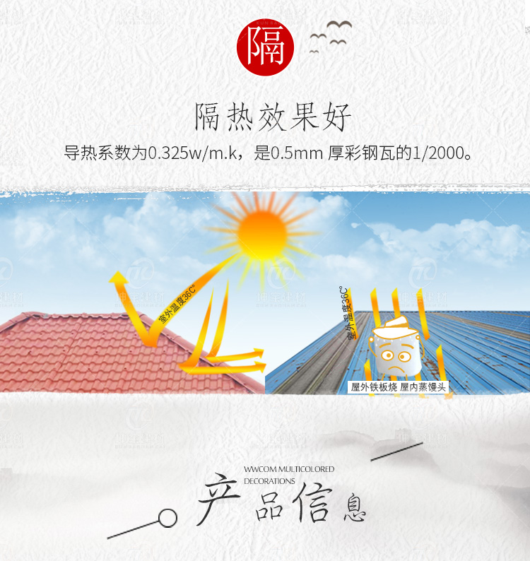 6.保溫隔熱好:導(dǎo)熱系數(shù)為 0.325w/m.k,大約是粘土瓦的 1/310,水泥瓦的 1/5,0.5mm 厚彩鋼瓦的1/2000。因此,在不考慮加保溫層的情況下,合成樹(shù)脂瓦的隔熱保溫性能仍能達(dá)到國(guó)家標(biāo)準(zhǔn)。