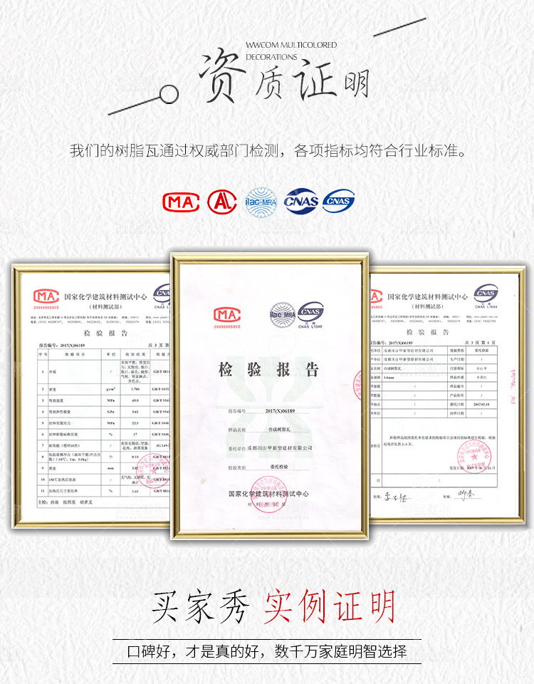 2.樹(shù)脂瓦致密、強(qiáng)度高,不易被冰雹打爛,更不會(huì)碎裂砸傷人或物品。