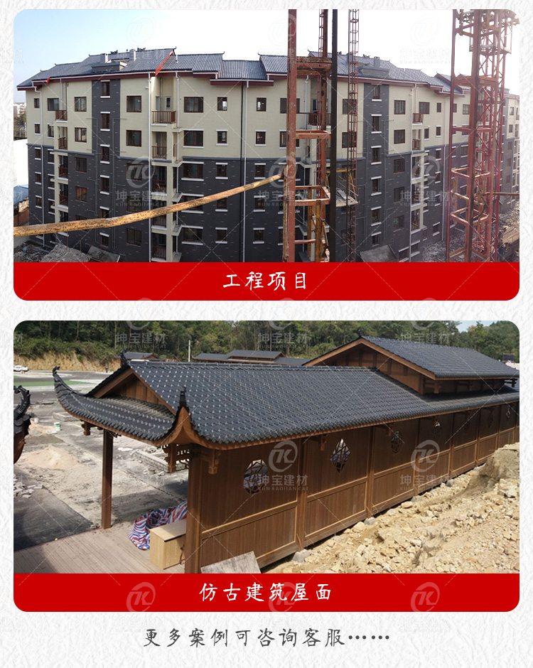 用途:平改坡屋面,別墅屋面,農(nóng)村自建房屋面,民宅屋面,工業(yè)廠(chǎng)房,仿古建筑,涼亭圍墻裝飾等